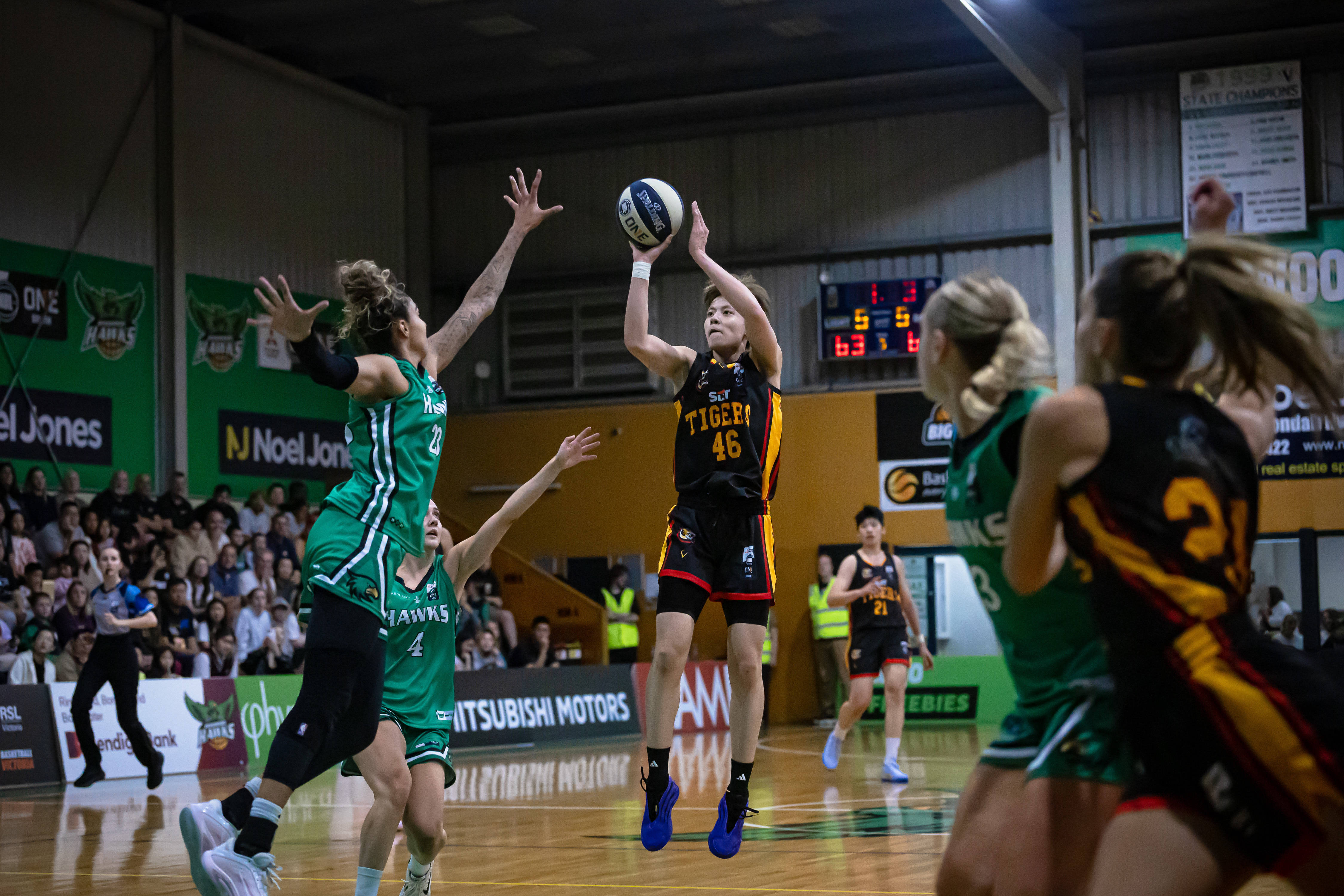 4月25日,墨尔本老虎队中国球员杨舒予(中)在比赛中。新华社发(金诚摄)本场比赛两边争夺热烈,主队在初始阶段一直荒谬,老虎队在第三节快律例时才将比分追平。参加第四节后不久,杨舒予、陈明伶二东谈主同期上场,杨舒予时时得分,陈明伶则在要津时候抢到后场篮板并变成对方犯规,老虎队最终以3分上风取胜。